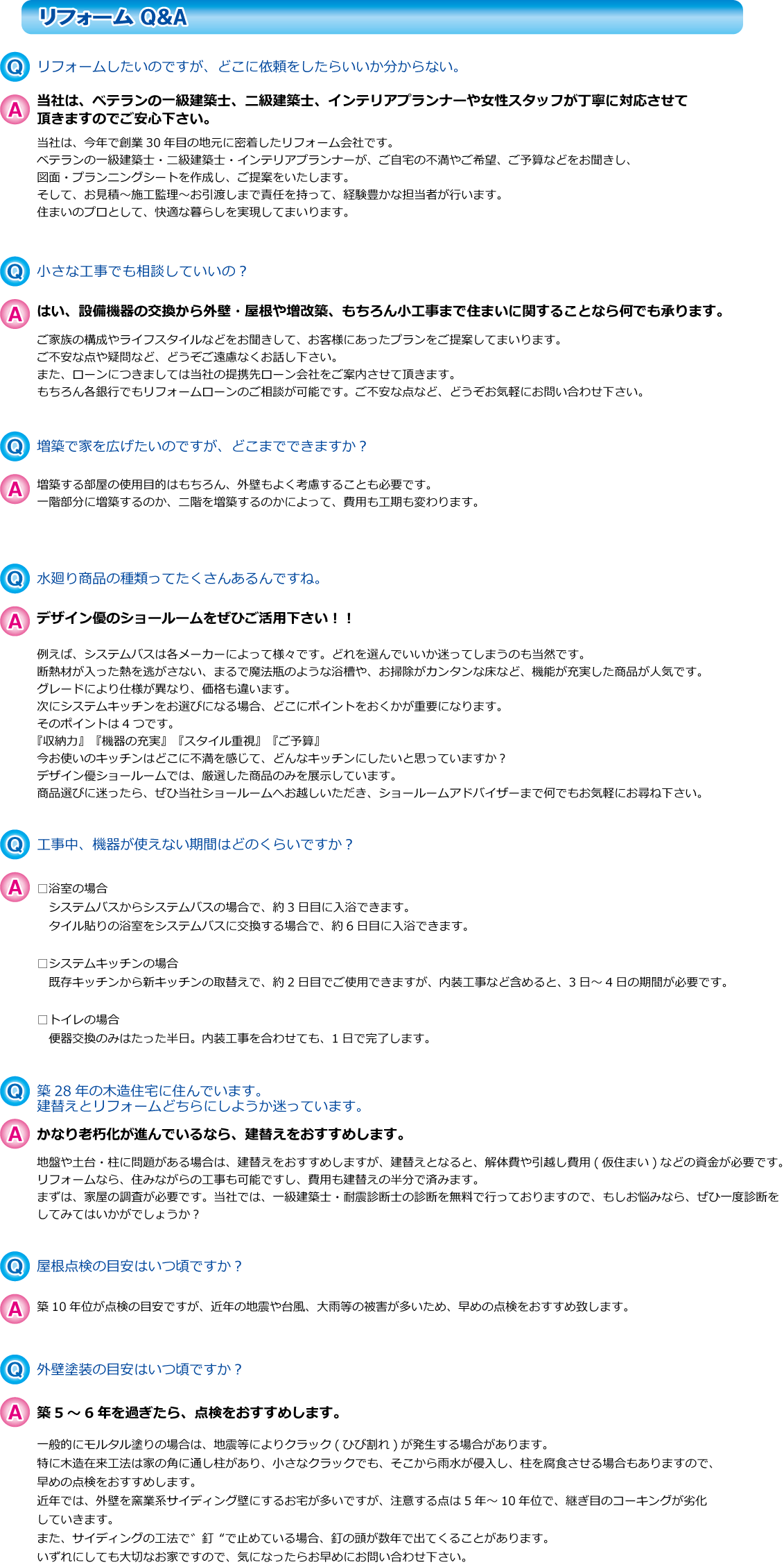 リフォームを考えたとき、疑問や質問は必ずあるものです。ここでは比較的お問合せの多かったQ&Aを掲載しております。
